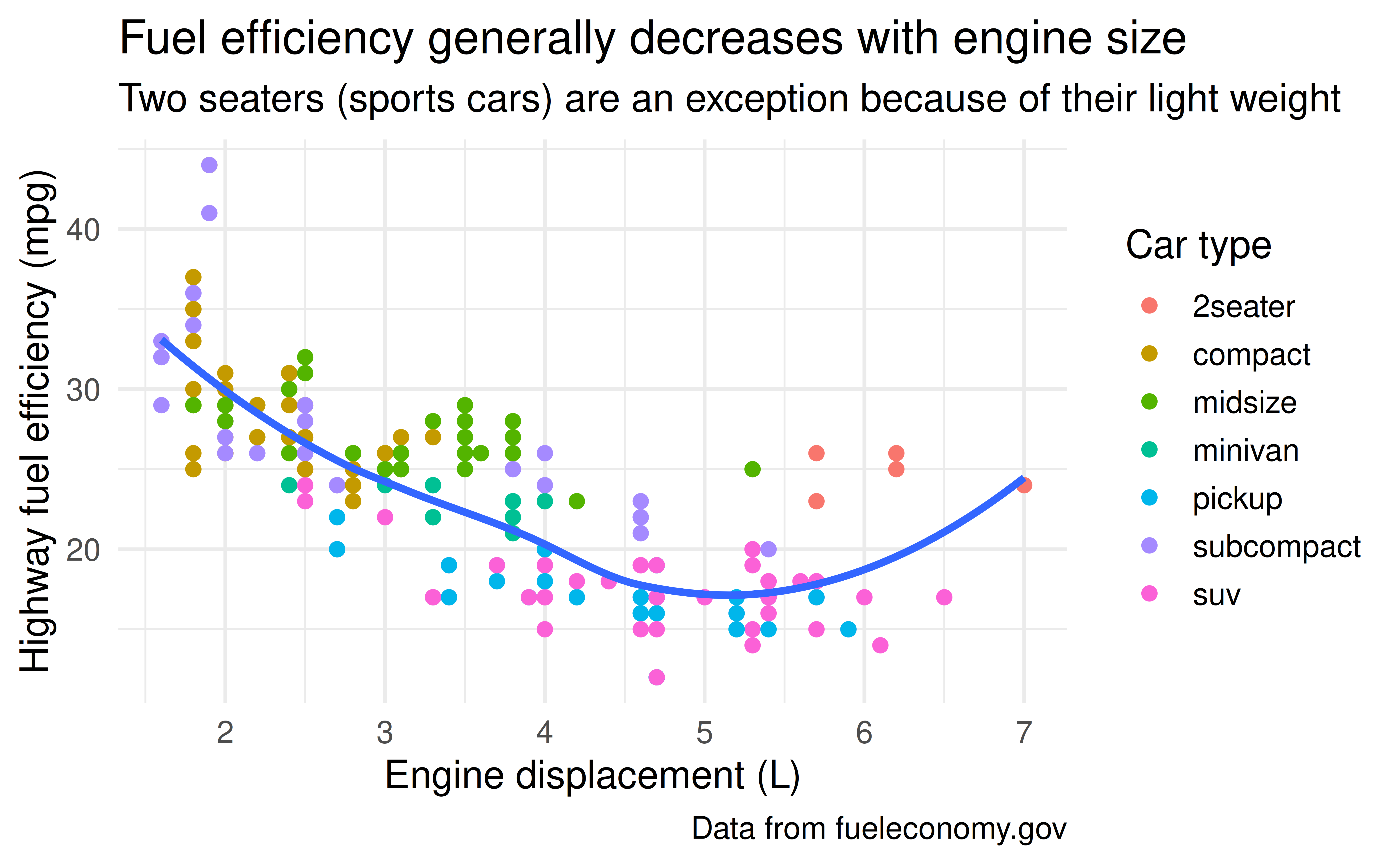 title = "Fuel efficiency generally decreases with engine size",