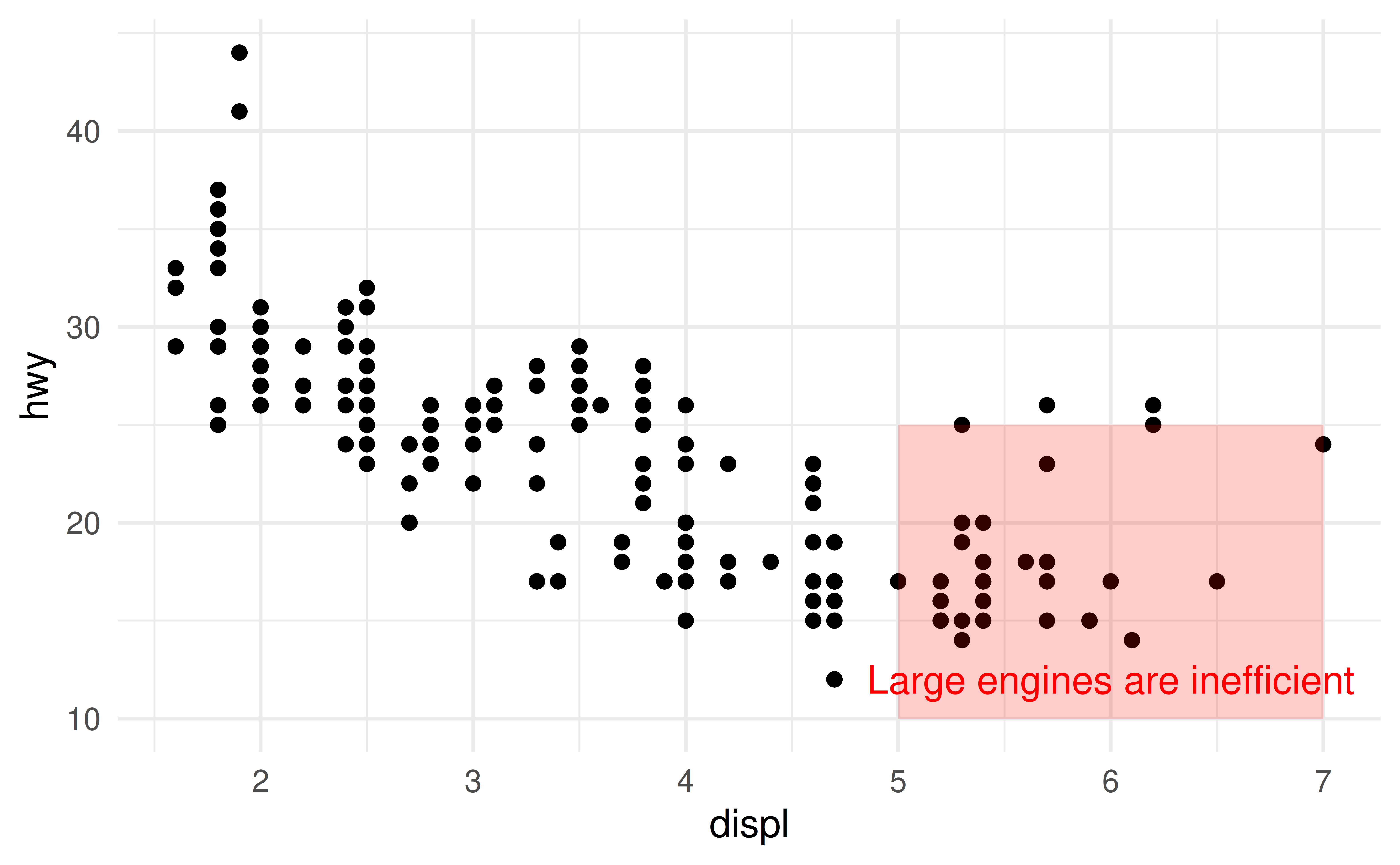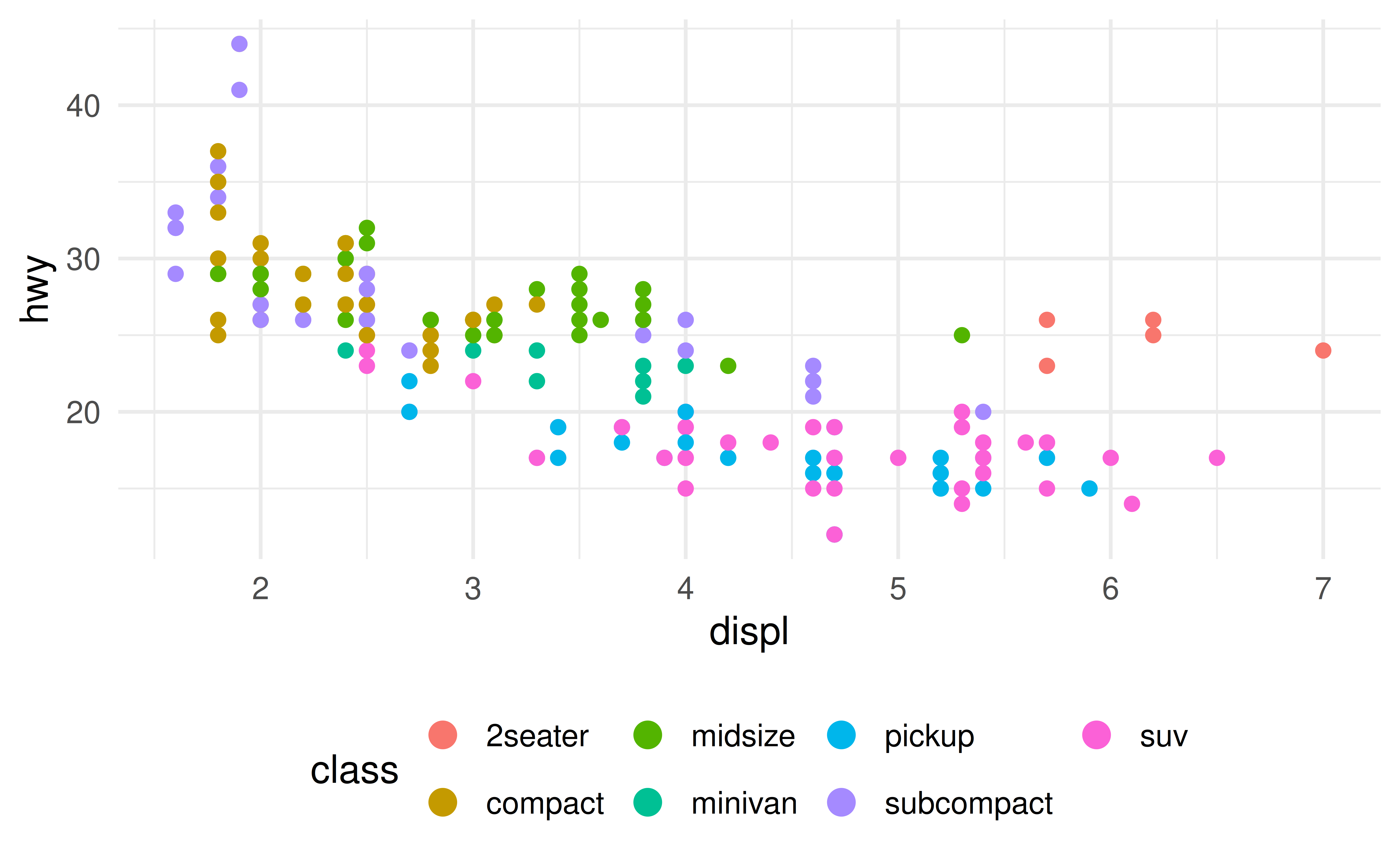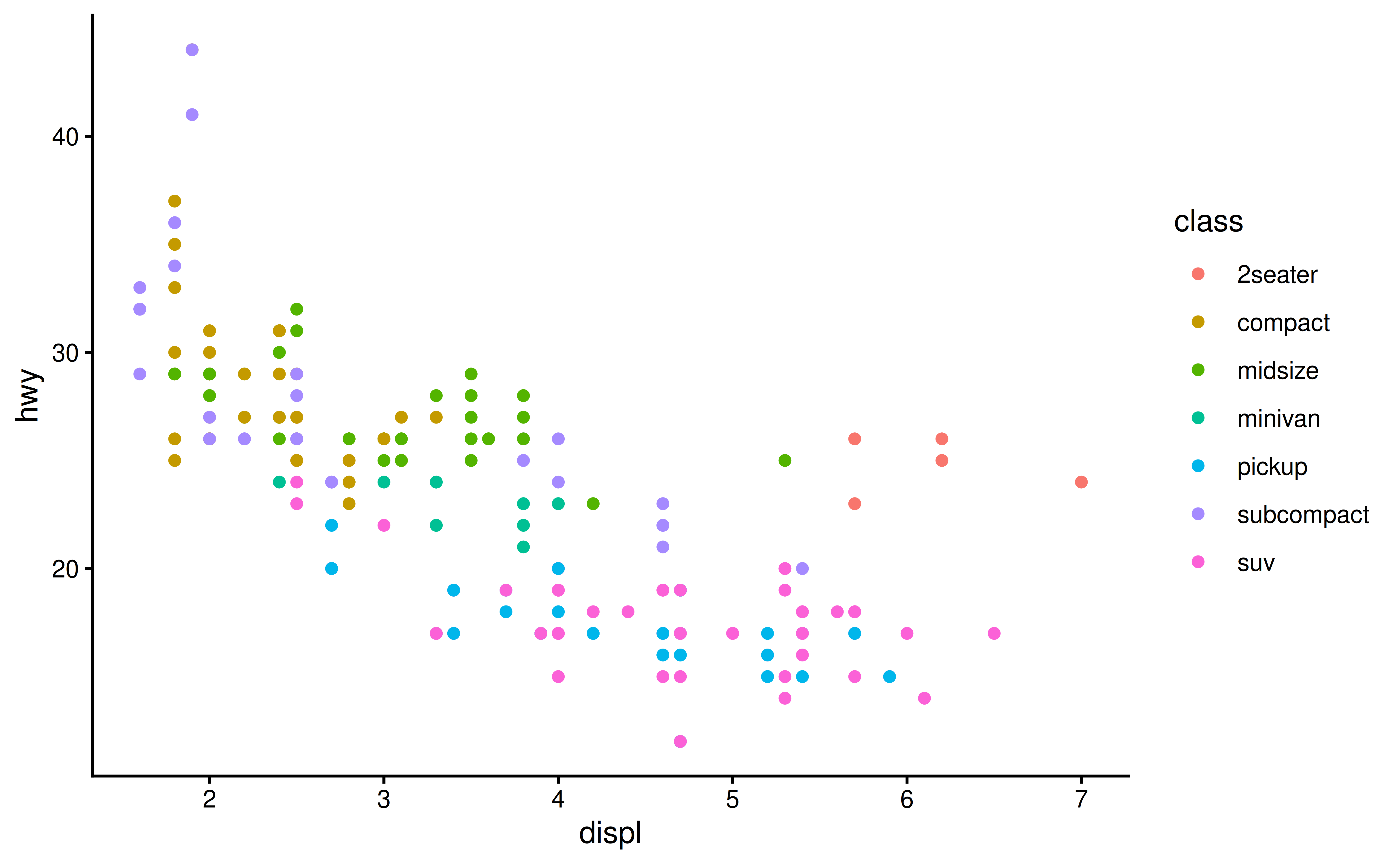 ggplot(mpg, aes(x = displ, y = hwy)) +