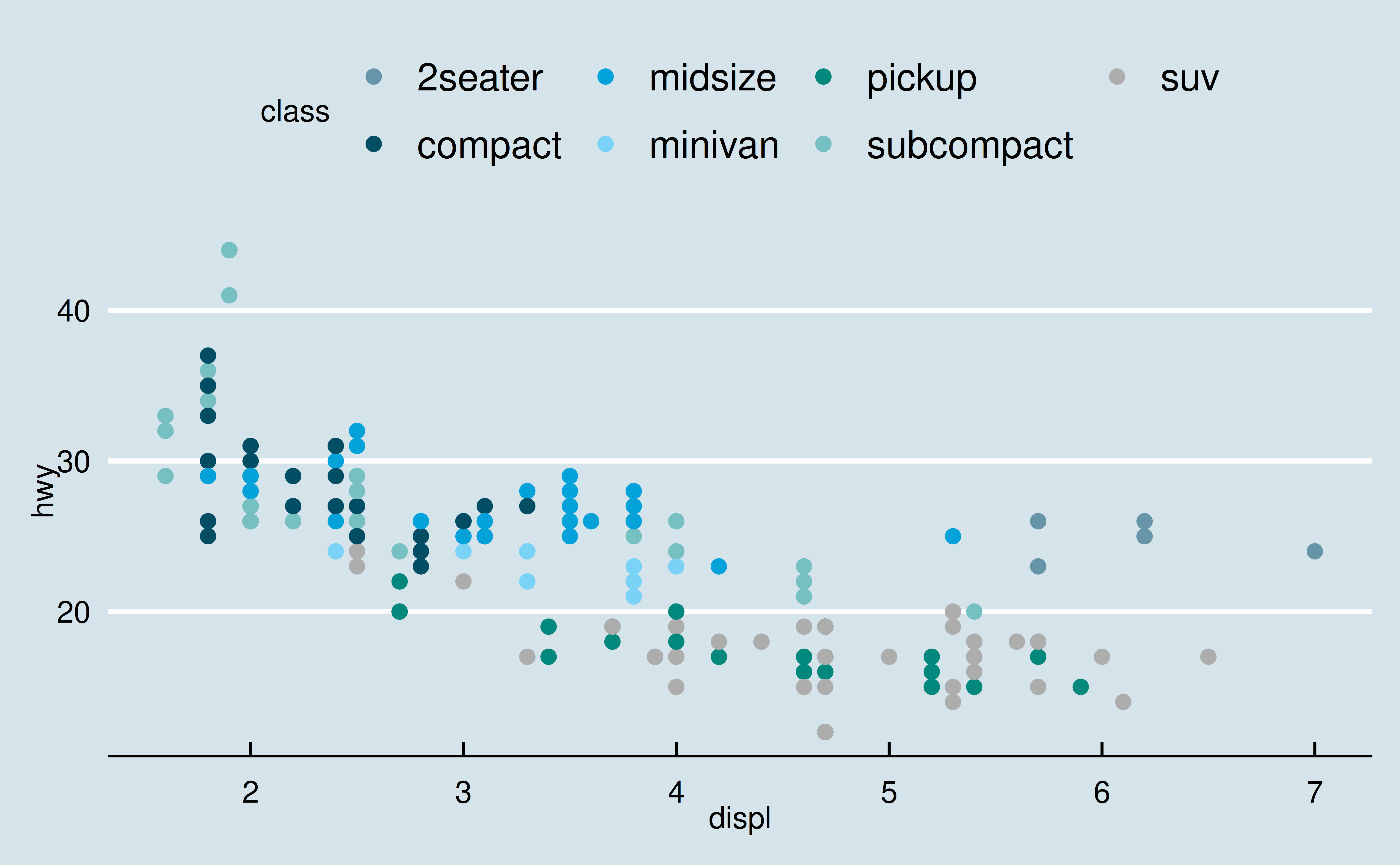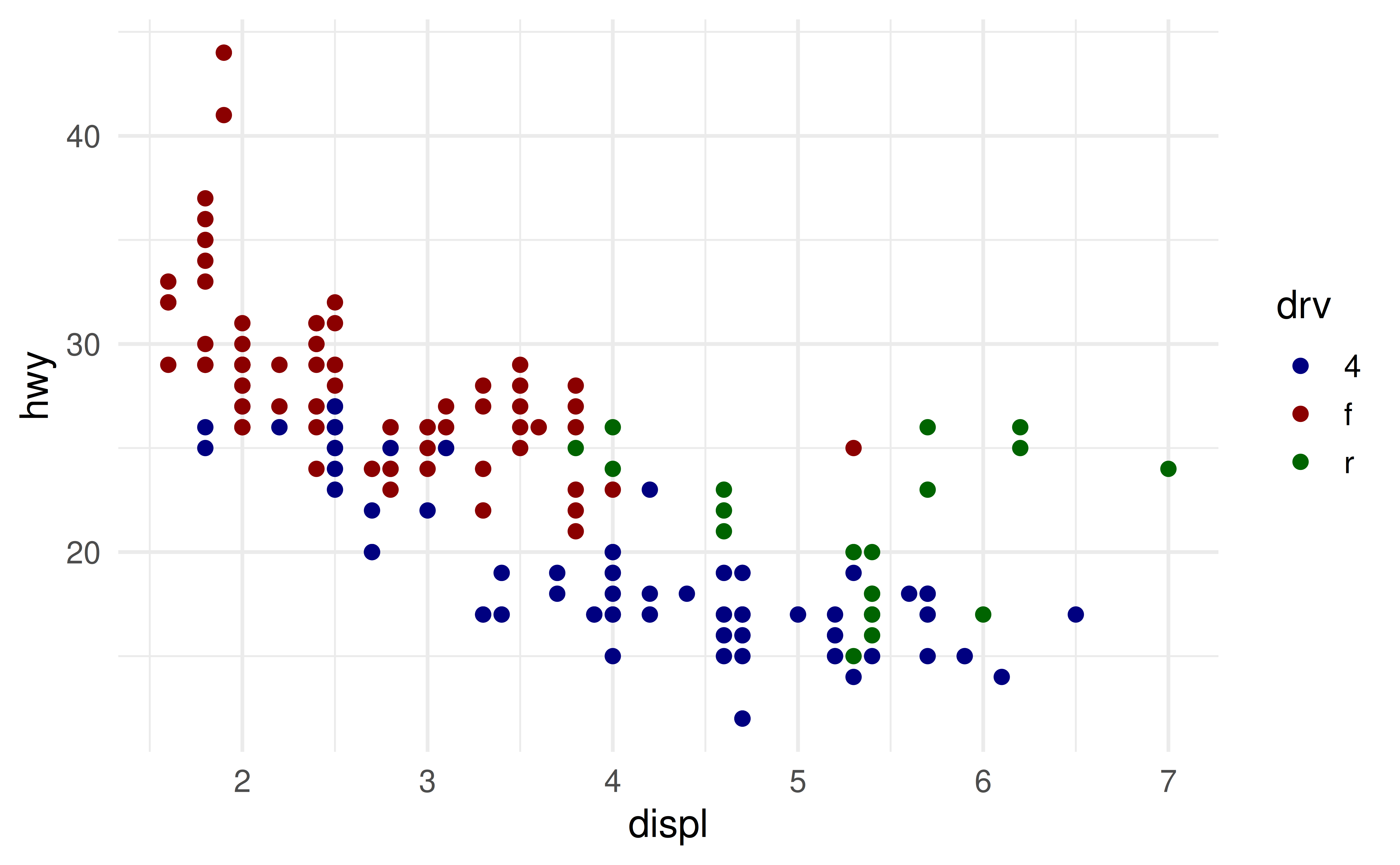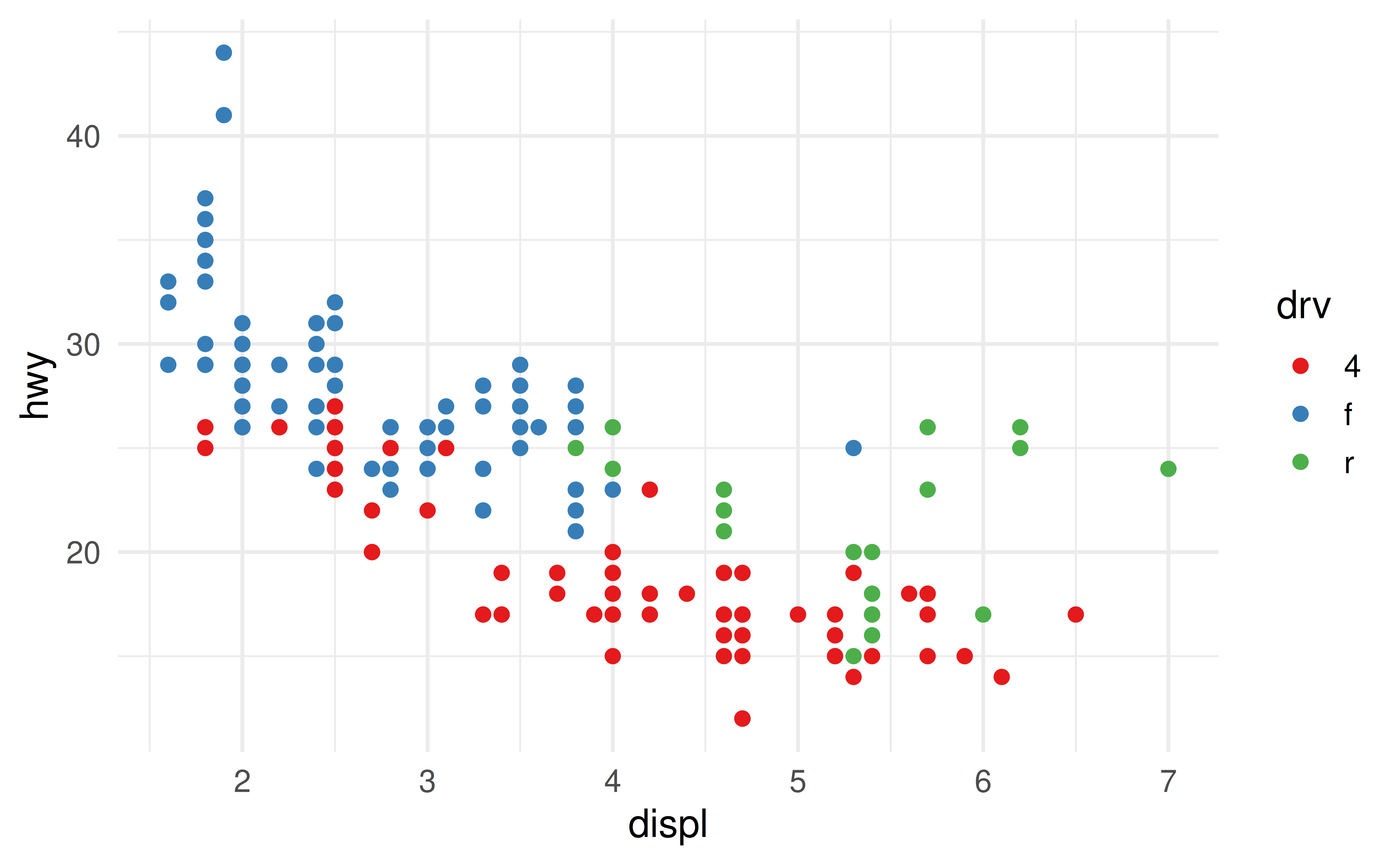 ggplot(mpg, aes(x = displ, y = hwy)) +