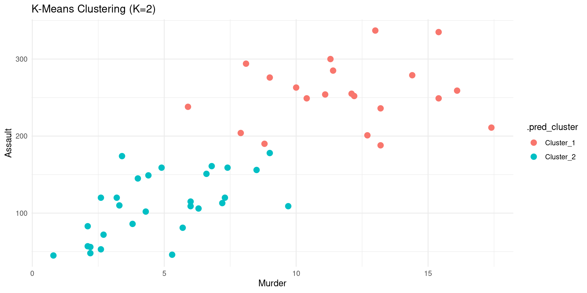 USArreststidyclustk_means() model specification.k=2 for this example)."stats".tidyclust~ . to specify that we want to use all variables.tidyclust cluster object